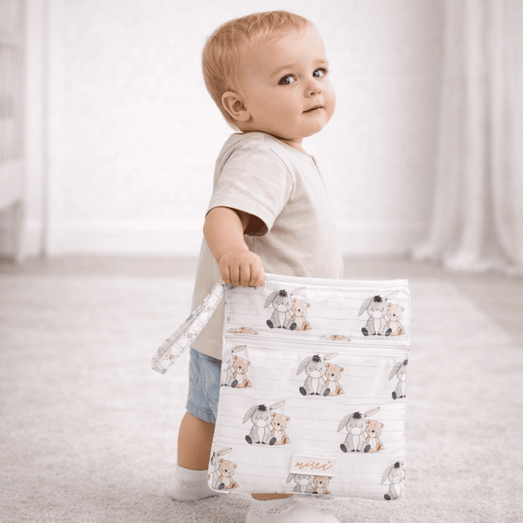 Bolsa grande impermeable diseñada para bebés, perfecta para guardar pañales, comida, mudas o ropa húmeda. Resistente al agua, fácil de limpiar y con estampados exclusivos de Mirea. Ideal para guardería, paseos o piscina.