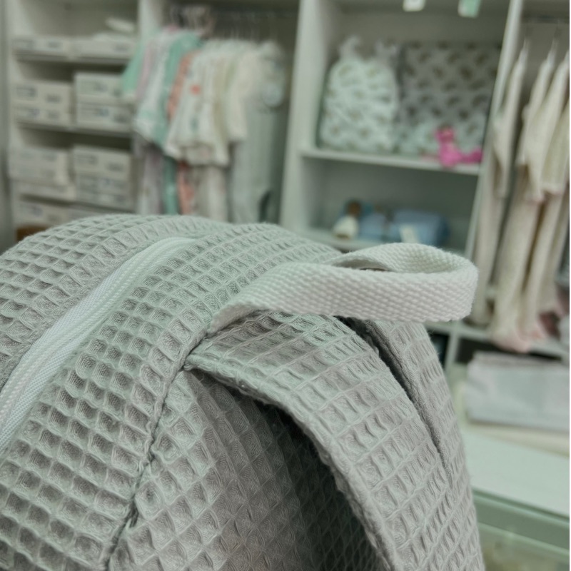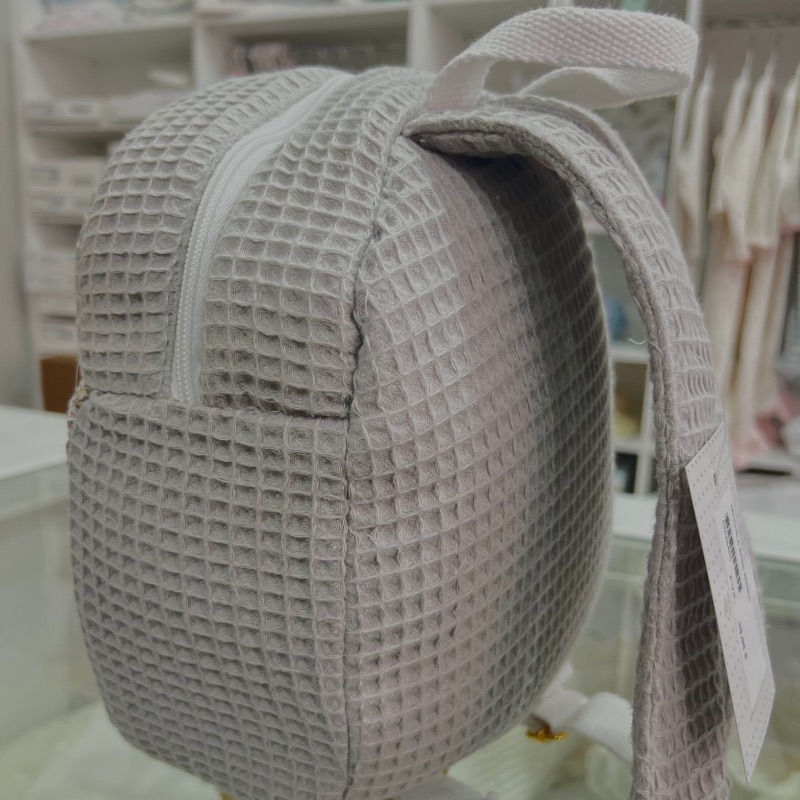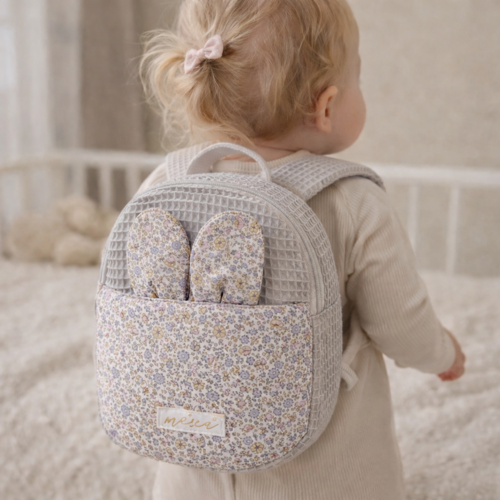 Mochila de tela para bebé hecha en España. Suave, ligera y con diseños exclusivos de Mirea. Perfecta para guardería, paseos y primeras aventuras.
