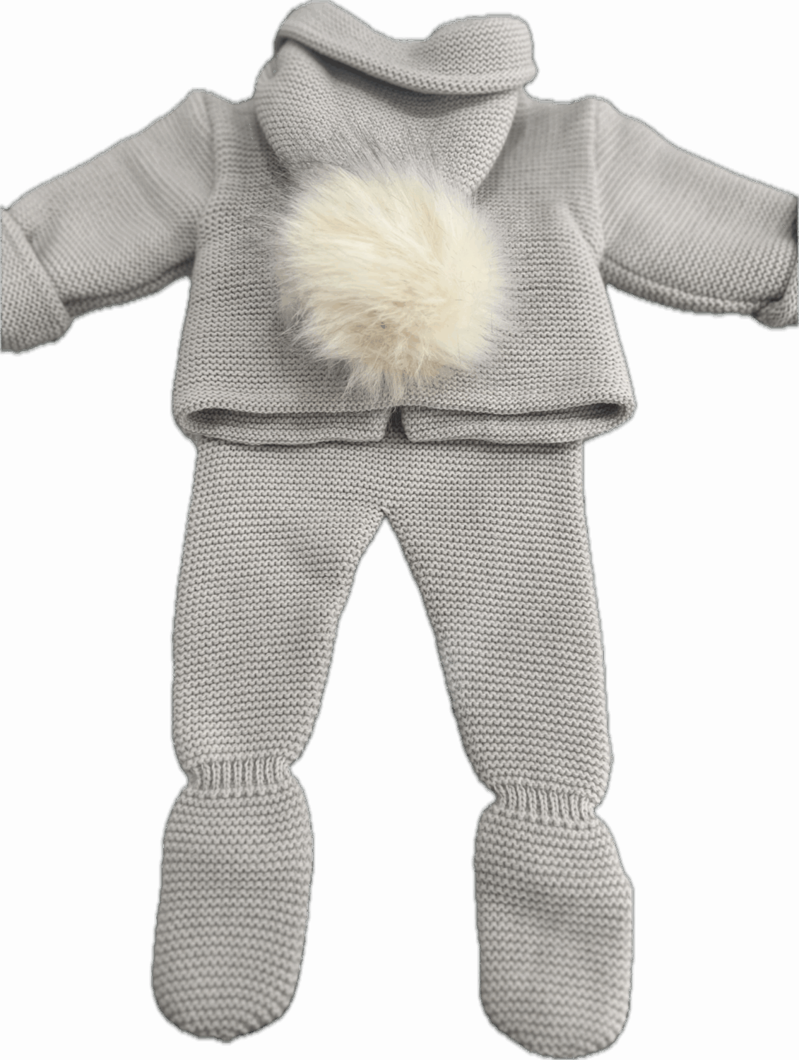 Conjunto para bebé en color piedra, compuesto por chaqueta con capucha que incluye un pompón, y pantalón con pies.