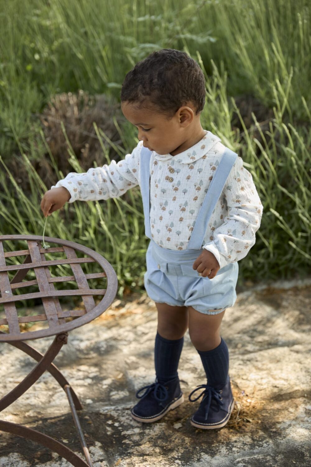Conjunto para bebé de Martin Aranda compuesto por Camisa de manga larga con estampado de pequeños árboles en tonos beige y azul, cuello redondo y cierre de botones frontales. Se combina con ranita corta azul con tirantes cruzados, bolsillos decorativos con botón y detalles fruncidos en los bajos para un look tierno y elegante.