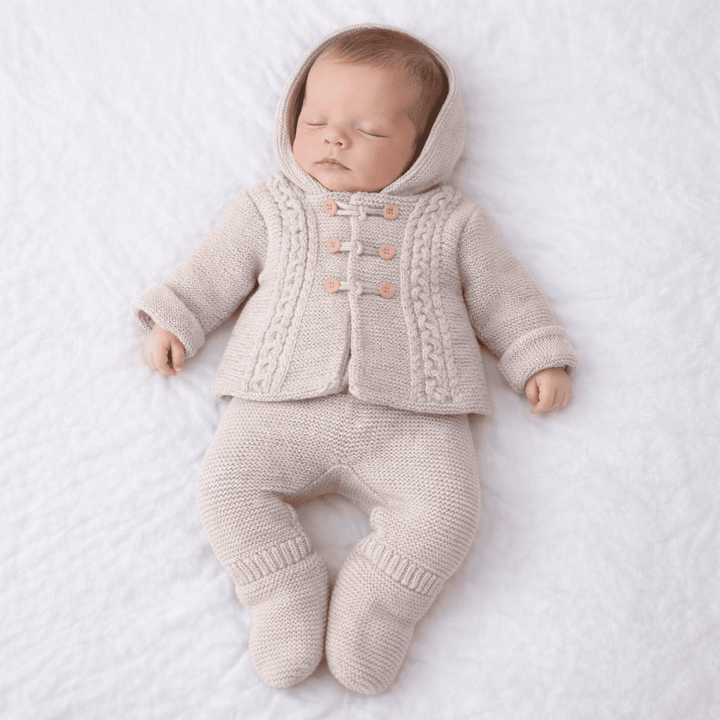 La chaqueta incluye botones delanteros y delicados detalles de trenza, ideal para mantener al bebé cómodo y abrigado con un estilo clásico y elegante.