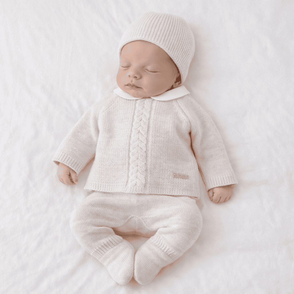 Es un conjunto cálido, suave y clásico, perfecto para los primeros días del recién nacido hasta los 3 meses.
