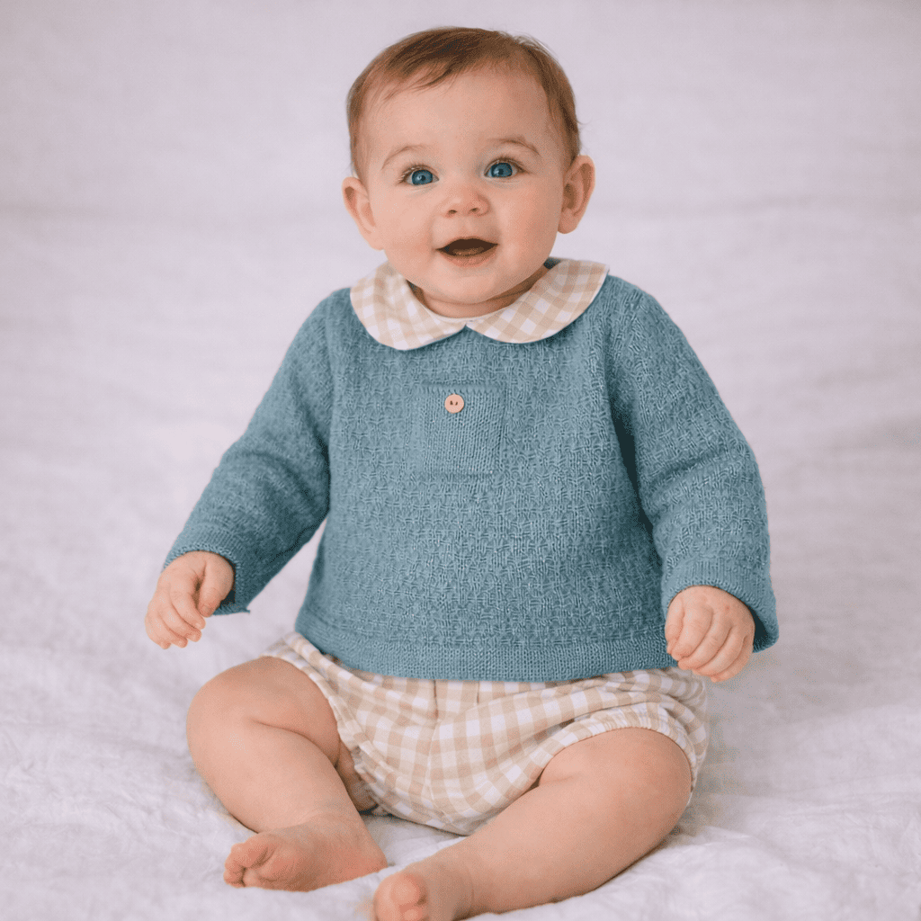 Conjunto de bebé de dos piezas compuesto por jersey y cubrepañal. El jersey de punto en tono verde luce un delicado tejido con bolsillo central y detalle de botón, combinado con un cuello bebé en tela vichy beige que aporta un aire clásico y elegante. La ranita a juego, también en vichy beige, completa el conjunto con un estilo fresco y cómodo para el día a día.