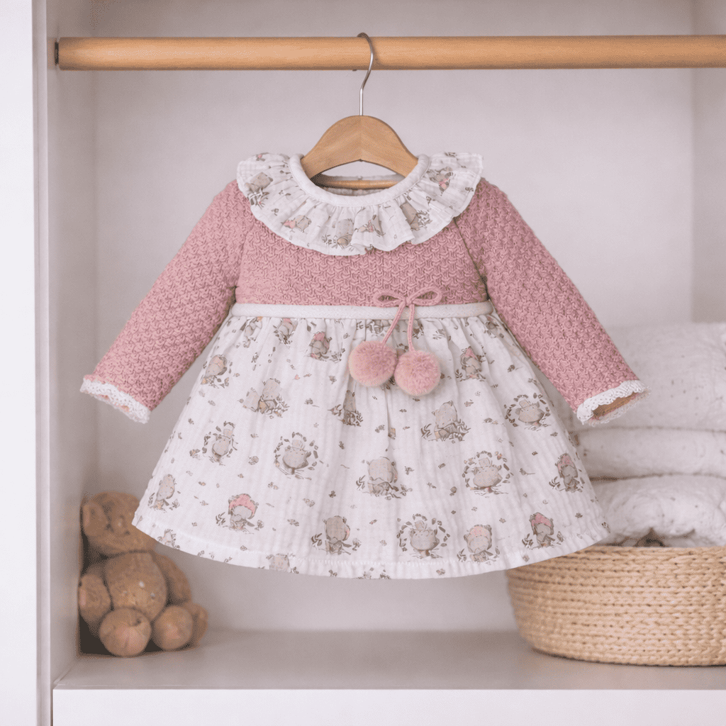 Este vestido para bebé está formado por una parte de arriba de punto, decorado con un lacito y unos pompones que aportan elegancia al pelele. La parte de abajo la compone una tela estampadita a juego con el cuello, lo que hace que la prenda sea ideal, elegante y sofisticada.