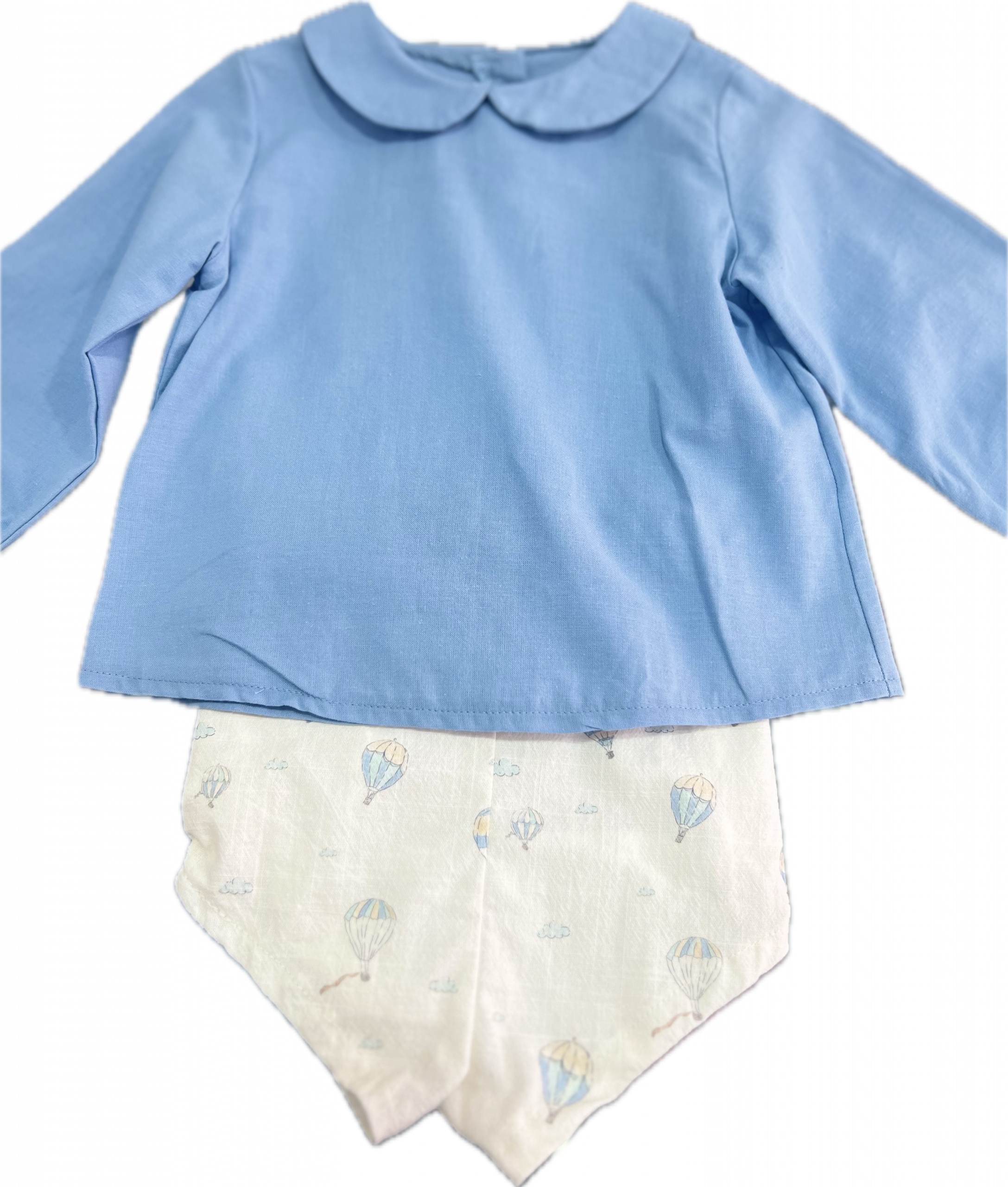 Es un conjunto formado de una camisa azul de cuello bebé. Los pantalones son estilo braguita que no tienen goma en la parte de adelante pero si en la parte de atrás.