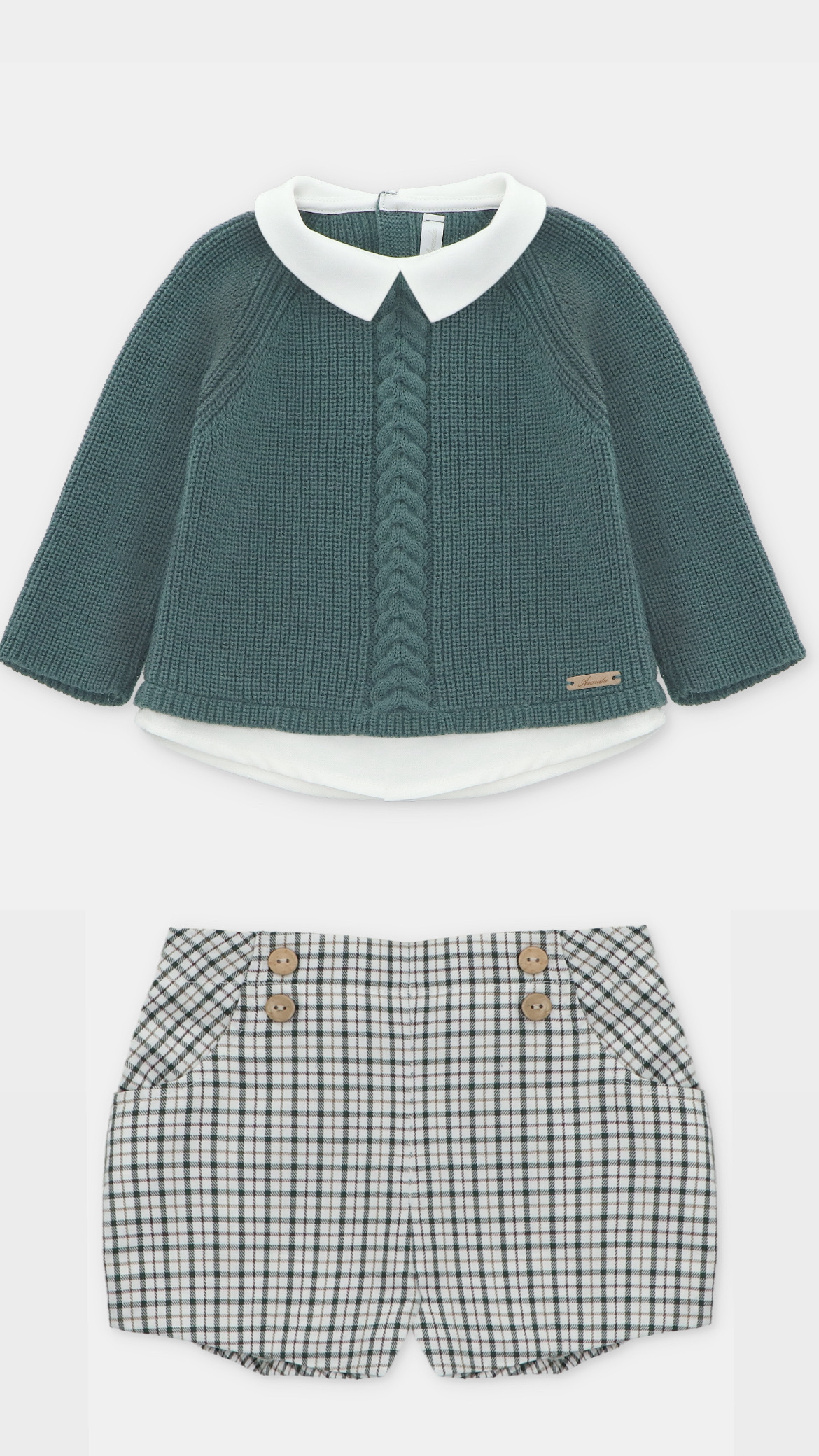 Este conjunto para niño combina elegancia y comodidad. Está formado por un jersey de punto verde y un pantalón corto de cuadros. El jersey tiene una trenza central y un cuello blanco tipo camisa, que le da un aire clásico y distinguido. El pantalón tiene tonos neutros, con botones decorativos de madera en la parte delantera.