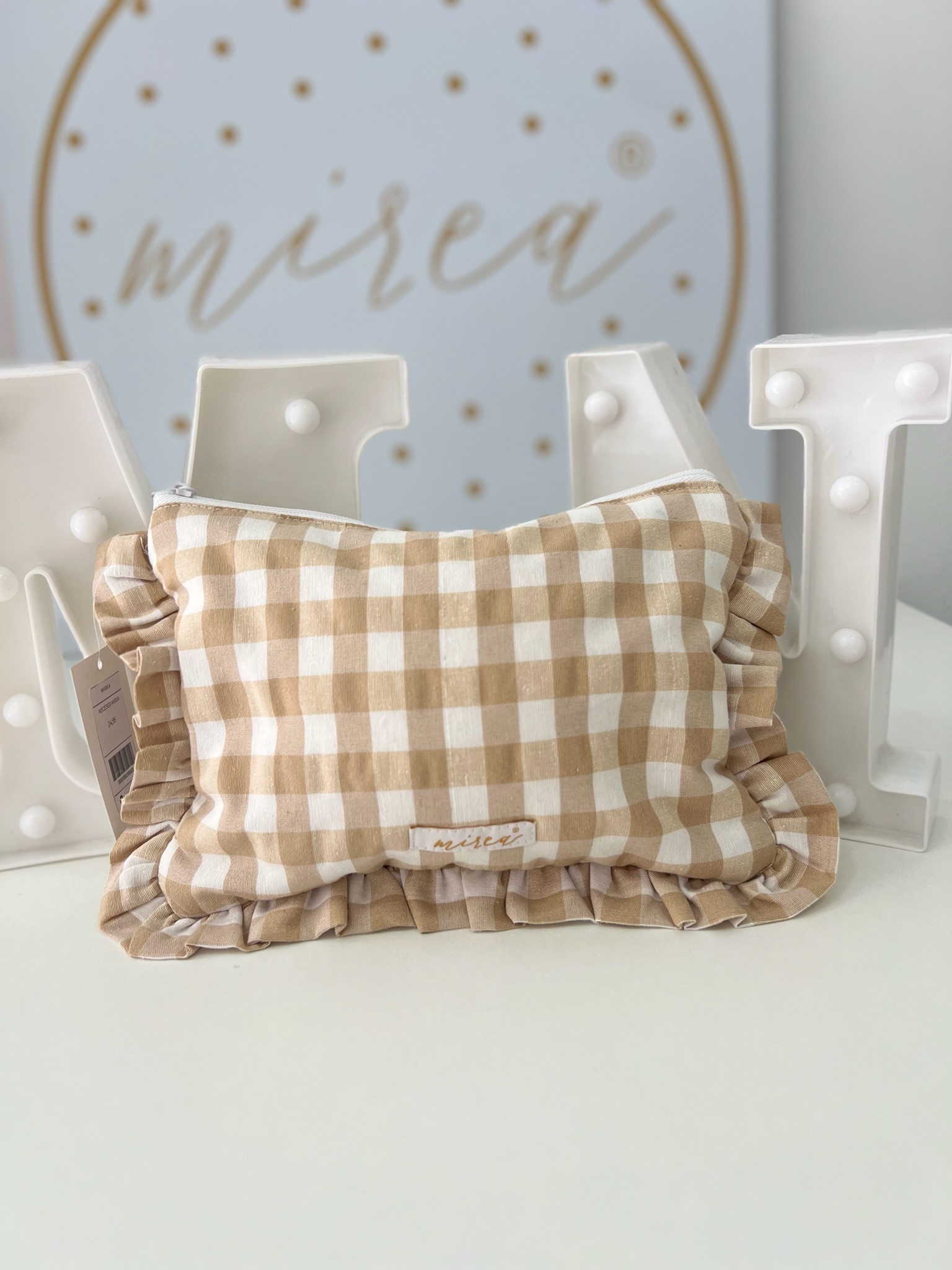 El neceser a cuadros beige y blancos Mirea es la opción perfecta para quienes buscan una organización elegante y práctica.