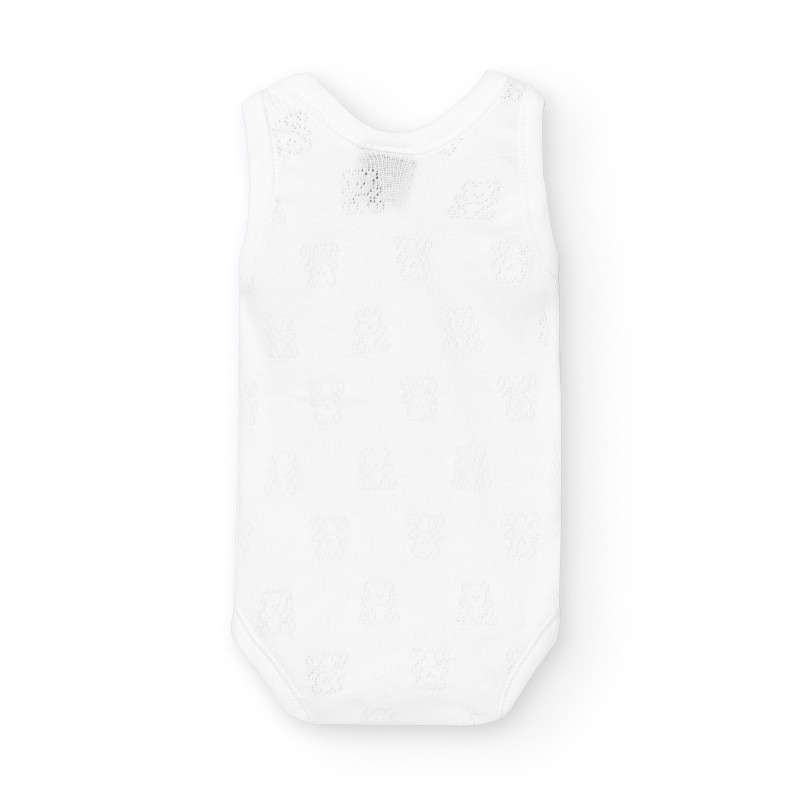 Este body blanco sin mangas es la prenda esencial para el vestuario de tu bebé. Confeccionado en un tejido suave y ligero, es ideal para mantener a tu pequeño fresco y cómodo durante todo el día. Disponible en tallas 3 | 6 | 12 | 18 meses, es perfecto para combinar con cualquier conjunto y facilitar el cambio de pañal.